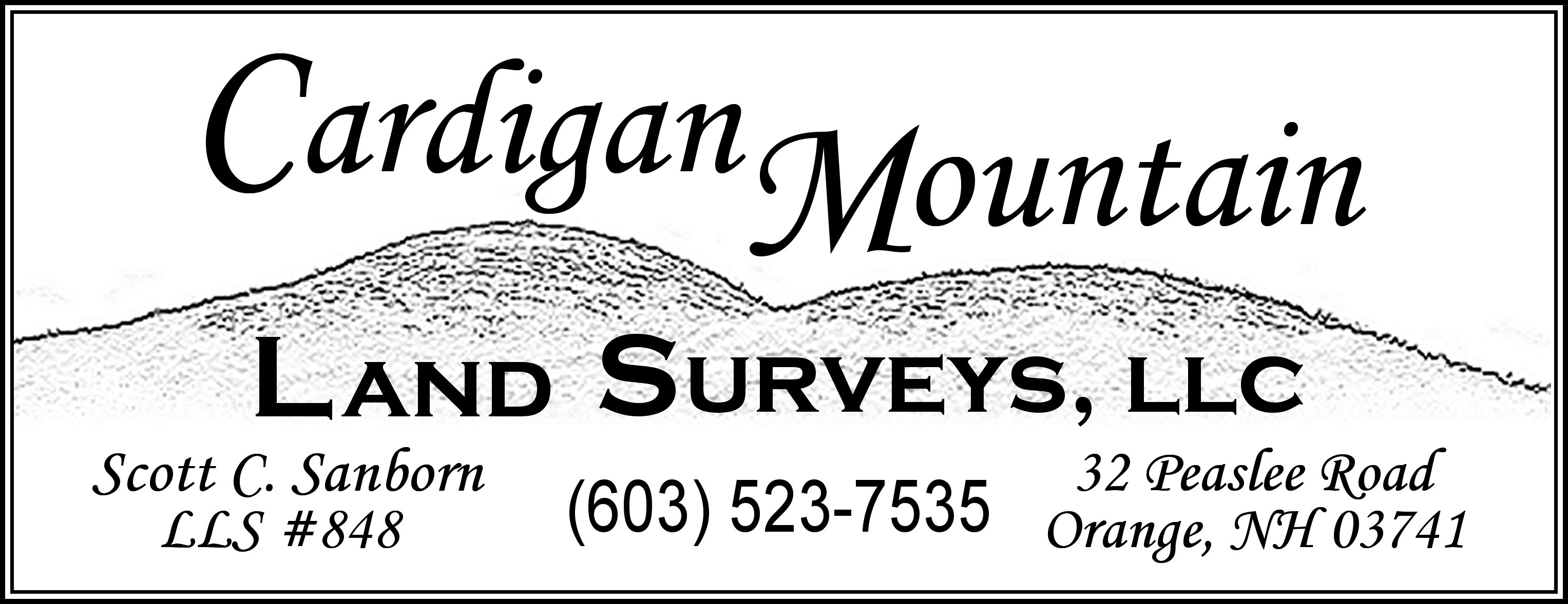 Thank you for visiting Cardigan Mountain Land Surveys, LLC. "CMLS" is owned and operated by Scott C. Sanborn, NH Licensed Land Surveyor, #848. Located in the small town of Orange, NH ... high on the side of Cardigan Mountain ... in west-central New Hampshire, my home base includes the Mascoma Valley, Dartmouth-Lake Sunapee and Lakes Regions of NH, but I am located such that I can conveniently serve the entire state.